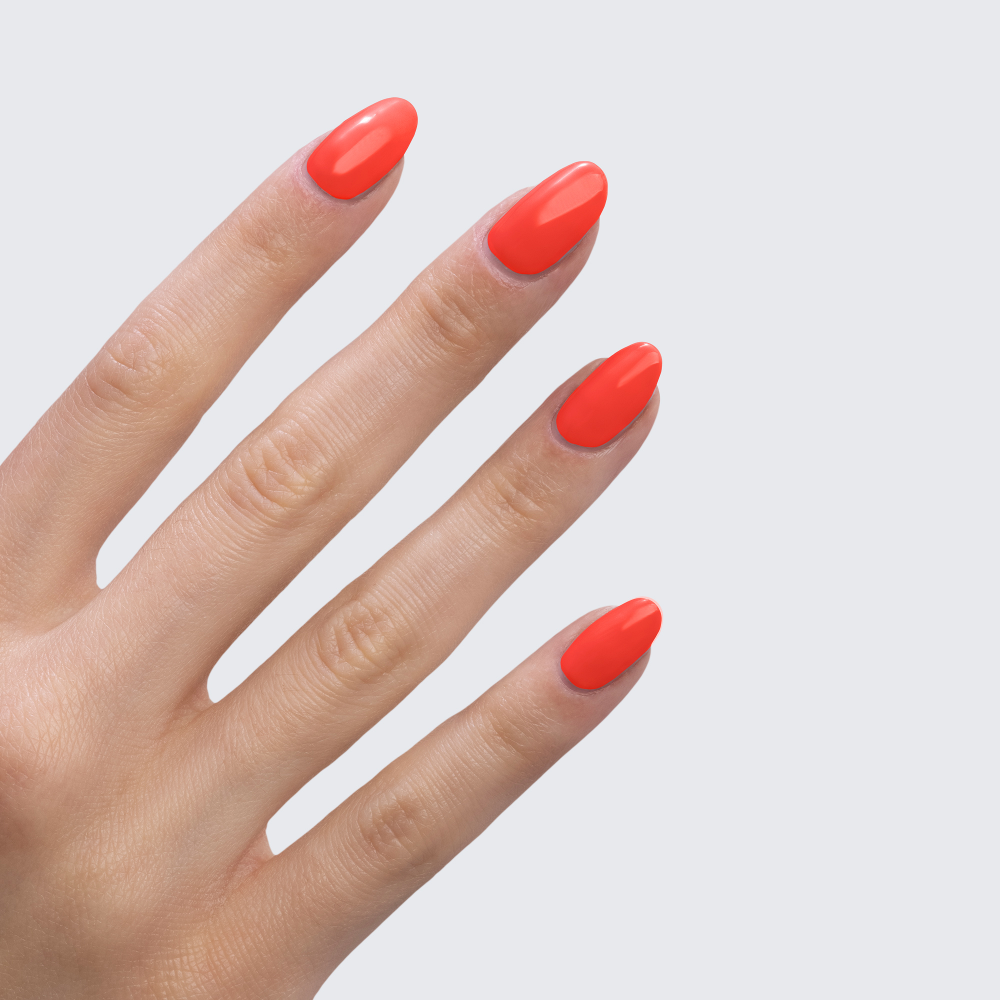 Neon orange. Bright. Cool undertone. Medium opacity / “coverage”.